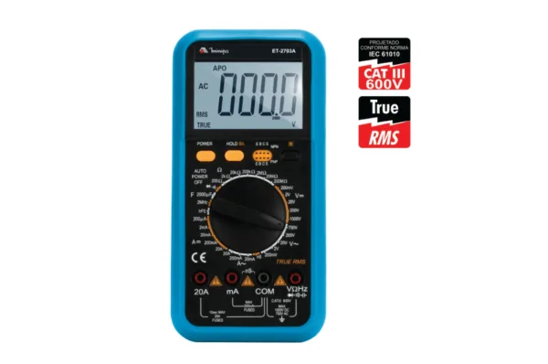 O Multímetro Digital ET-2703A oferece medições rápidas e precisas com um display LCD de 3 1/2 dígitos e taxa de atualização de 3 vezes por segundo. Compacto e robusto, é ideal para testes de voltagem, corrente e resistência, com recursos como True RMS, Data Hold e auto range.